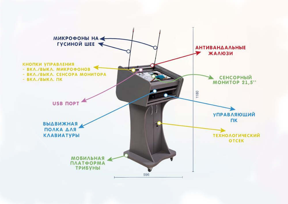 Вы можете не беспокоится о сохранности экрана при транспортировке трибуны – он защищен антивандальным стеклом. Корпус кафедры мы выполнили из ударопрочного пластика, что делает интерактивный многофункциональный подиум визуально привлекательным. Мультимедийная трибуна оснащена всем необходимым функционалом для презентации и выступлений.