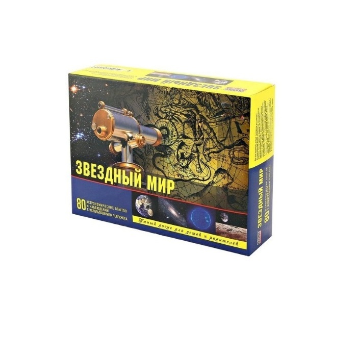 Набор «Звездный мир» предлагает Вам, вооружившись телескопом, узнать окружающий мир с новых, неведомых ранее сторон. Вы сможете наблюдать множество объектов, затерянных в просторах Вселенной. Звезды! Кометы! Спутники! Планеты! Границы обозримого мира отодвинутся в бесконечность. Набор позволяет собрать модель Солнечной Системы, провести 80 астрономических опытов и наблюдений с использованием телескопа.