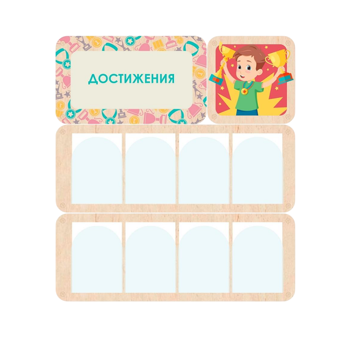 Стенд информации для детского сада, который рассказывает учащимся и родителям о детских достижениях. В акриловых карманах можно разместить грамоты, дипломы, списки победителей и многое другое. Яркий заголовок акцентирует внимание посетителей на этой информации.