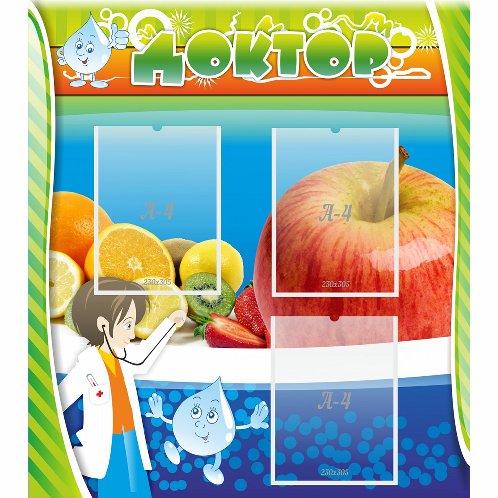 Основа дизайна стенда - источники витаминов: фрукты и ягоды. Юный доктор и Капелька готовы рассказать о пользе витаминов, правилах закаливания и о многом другом, что позволит укрепить здоровье воспитанников детского сада. А три кармана формата А4, дают возможность комфортно разместить эту информацию.