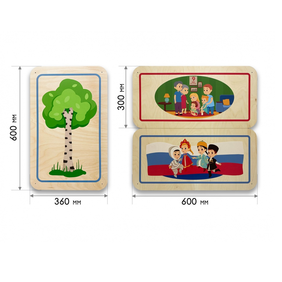 Дополнительные модули бывают однотонные и с тематическими иллюстрациями, подходящими под тематику дидактических панелей. Разнообразие размеров способствует декорированию стен различной конфигурации и масштабов. Параметры варьируются от совсем маленьких модулей 300х300 мм до крупных размеров 600х600 мм.